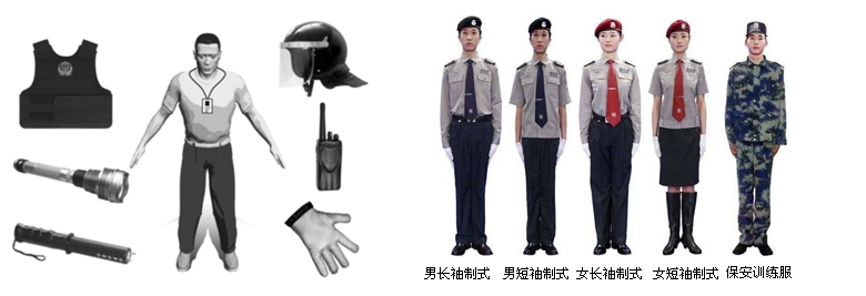 ·裝備列表: 服裝、鞋帽、腰帶、防割手套\領帶、對講機、多功能巡邏棒、手提式手電筒、強光手電\橡膠棍、滅火器、巡更系統等